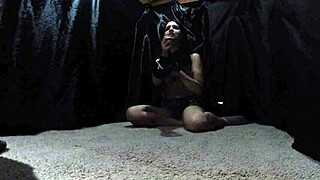 Bound slave receives deep throat treatment