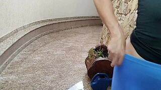 stepmom in gym shorts feels stepson rubbing cock on her big ass while watering flowers?