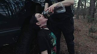 Damn! Submissive cutie eats ass and takes piss at roadside picnic. Then rough face fucking!